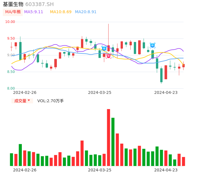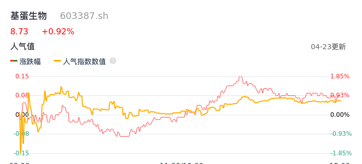 04月23日,基蛋生物收报8.73,股价涨幅0.92%,成交金额2345.20万元,换手率0.53%。