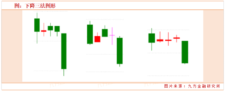“三法”是最常见的阴阳线连续形态之一,可视为暂停交易或休整期间,即我们常说的盘整期。内涵是市场对于趋势的持续力产生怀疑,就像上山或下山中的平缓地带,这种情况一般不会改变原有运行趋势。"三法"形态分为上升三法和下降三法,本期我们拆解后者。