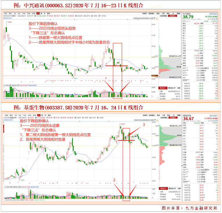 中兴通讯(000063.SZ)2020年7月16—23日K线组合、基蛋生物(603387.SH)2020年7月16、24日K线组合。