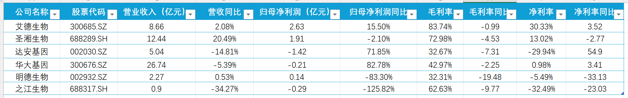 从分子诊断代表性企业的整体表现来看,其业绩好于其他细分领域。其中,艾德生物以营收和净利的双增长领跑行业,营收和归母净利润分别同比增长2.08% 和15.5%,毛利率仅出现微降;圣湘生物营收同比大增20.49%,净利润降幅较小;达安基因与华大基因虽尚未实现盈利,但净利润亏损幅度已大幅收窄。