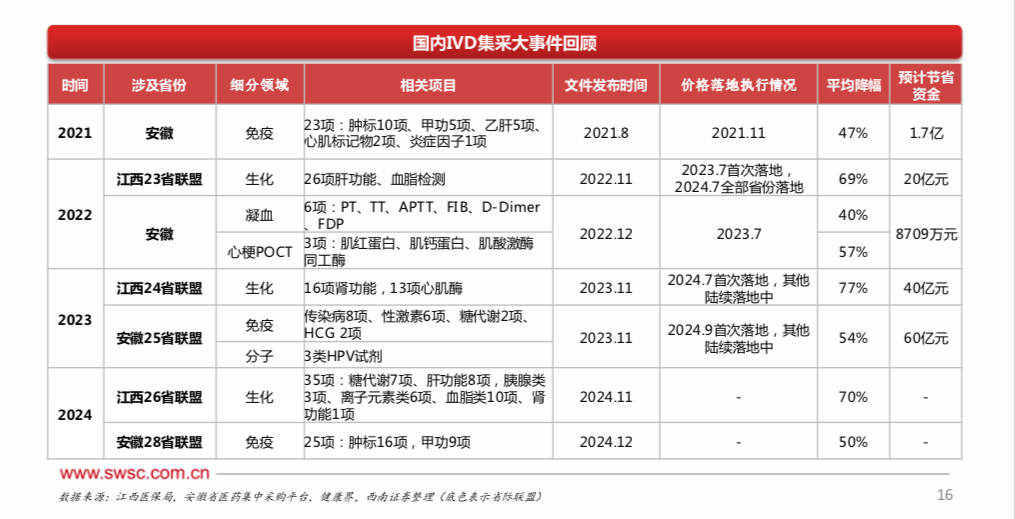 统计显示,截至2024年,IVD已完成5轮省联盟集采,包括江西牵头的3轮生化试剂集采以及安徽牵头的2轮免疫试剂集采,集采范围基本已覆盖核心品种和省市。