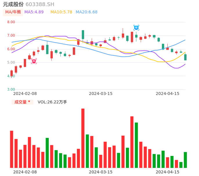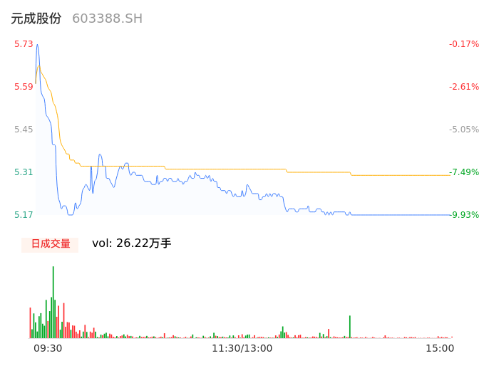 04月15日,元成股份收报5.17,股价涨幅-9.93%,成交金额1.39亿元,换手率8.05%。