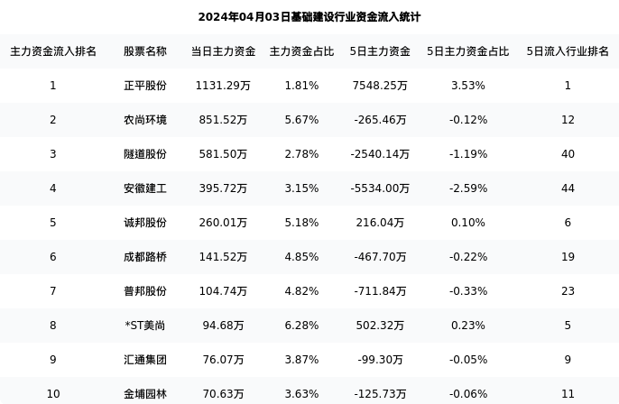 从主力资金流向来看,基础建设行业今日主力资金流入20.05亿元,在所有申万二级行业中排名:42/131。