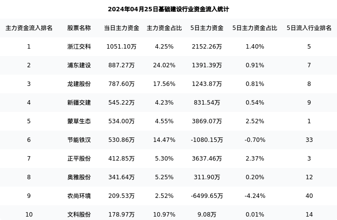 从主力资金流向来看,基础建设行业今日主力资金流入15.23亿元,在所有申万二级行业中排名:128/131。
