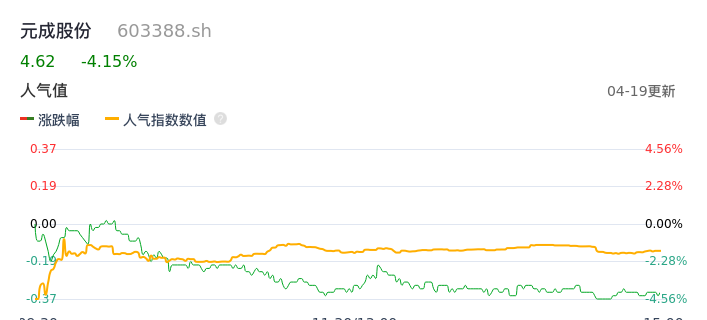 04月19日,元成股份收报4.62,股价涨幅-4.15%,成交金额6288.45万元,换手率4.12%。
