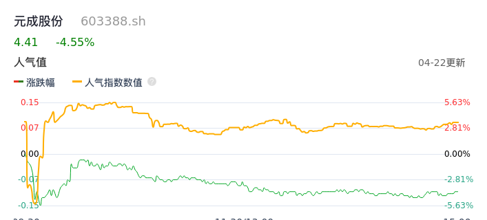 04月22日,元成股份收报4.41,股价涨幅-4.55%,成交金额6385.92万元,换手率4.39%。