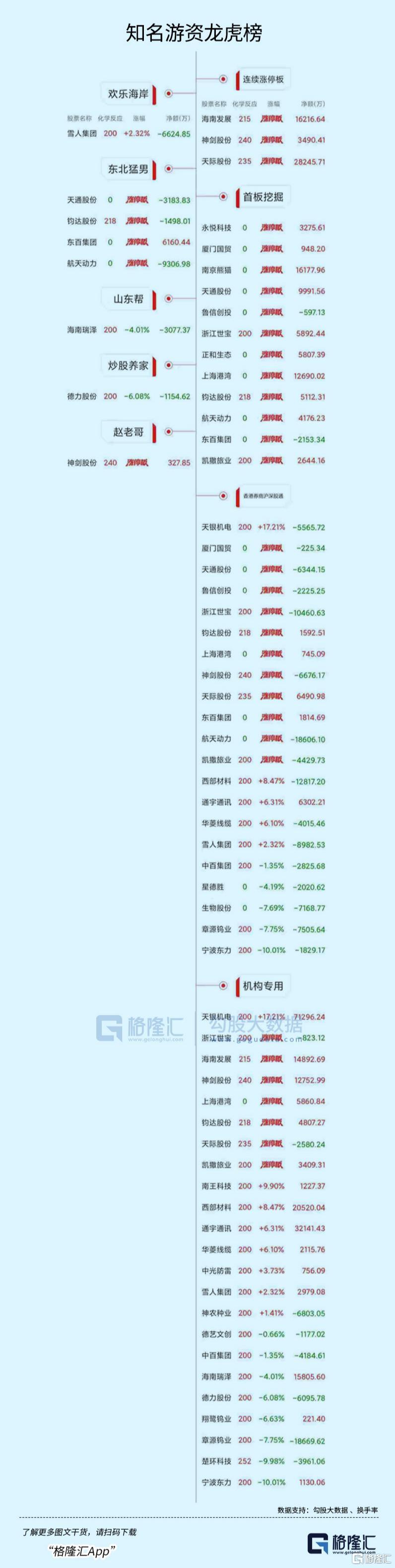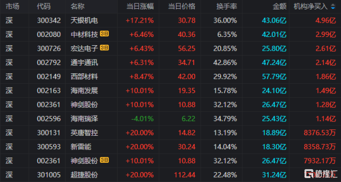 龙虎榜中涉及机构专用席位的个股中,当日净买入额前三为天银机电、通宇通讯、西部材料,分别为4.96亿元、2.14亿元、1.86亿元。