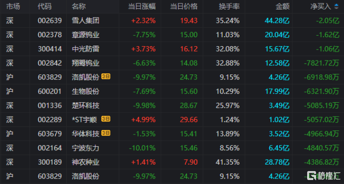 龙虎榜单日净卖出额前三为雪人集团、章源钨业、中光防雷,分别为2.05亿元、1.62亿元、1.06亿元。