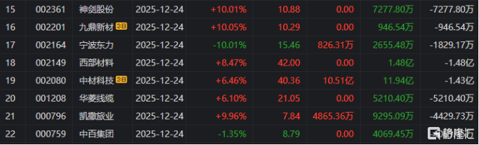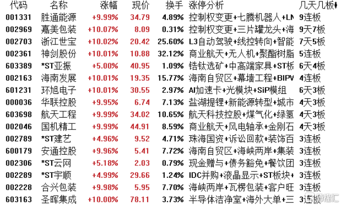 高位股方面,胜通能源9连板,嘉美包装9天7板,浙江世宝7天5板,神剑股份5连板,*ST亚振6天4板,海南发展4连板,环旭电子6天3板,华联控股、航天工程、国机精工4天3板。
