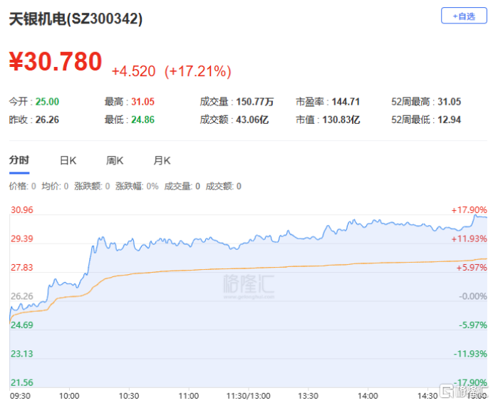 天银机电:今日上涨17.21%,全天换手率36.00%,成交额43.06亿元。机构净买入4.96亿元,深股通净卖出5565.72万元,营业部席位合计净卖出9651.74万元。