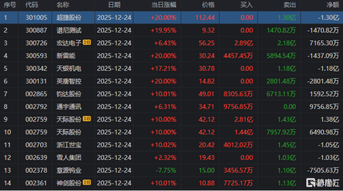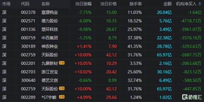 龙虎榜中涉及机构专用席位的个股中,当日净卖出额前三为章源钨业、德力股份、楚环科技,分别为1.64亿元、4718.73万元、3961.07万元。