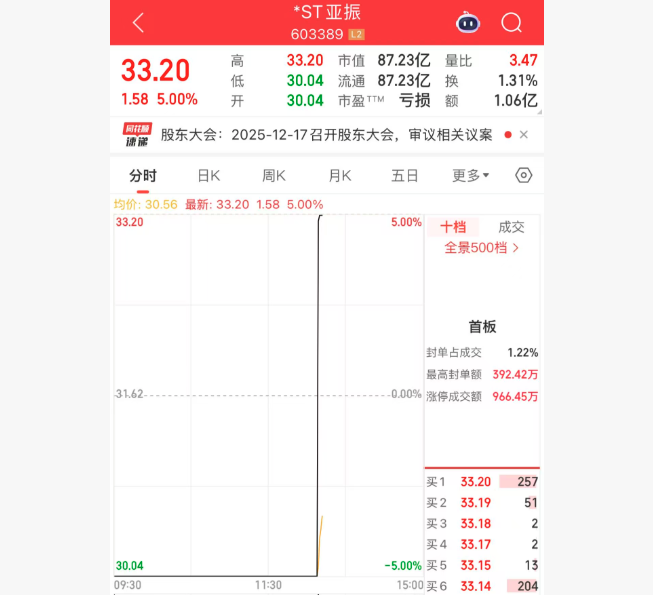 上证报中国证券网讯12月17日,已经连续5个交易日跌停的*ST亚振午后直线拉升,上演“地天板”行情,股价报33.20元/股,成交额达1.06亿元。