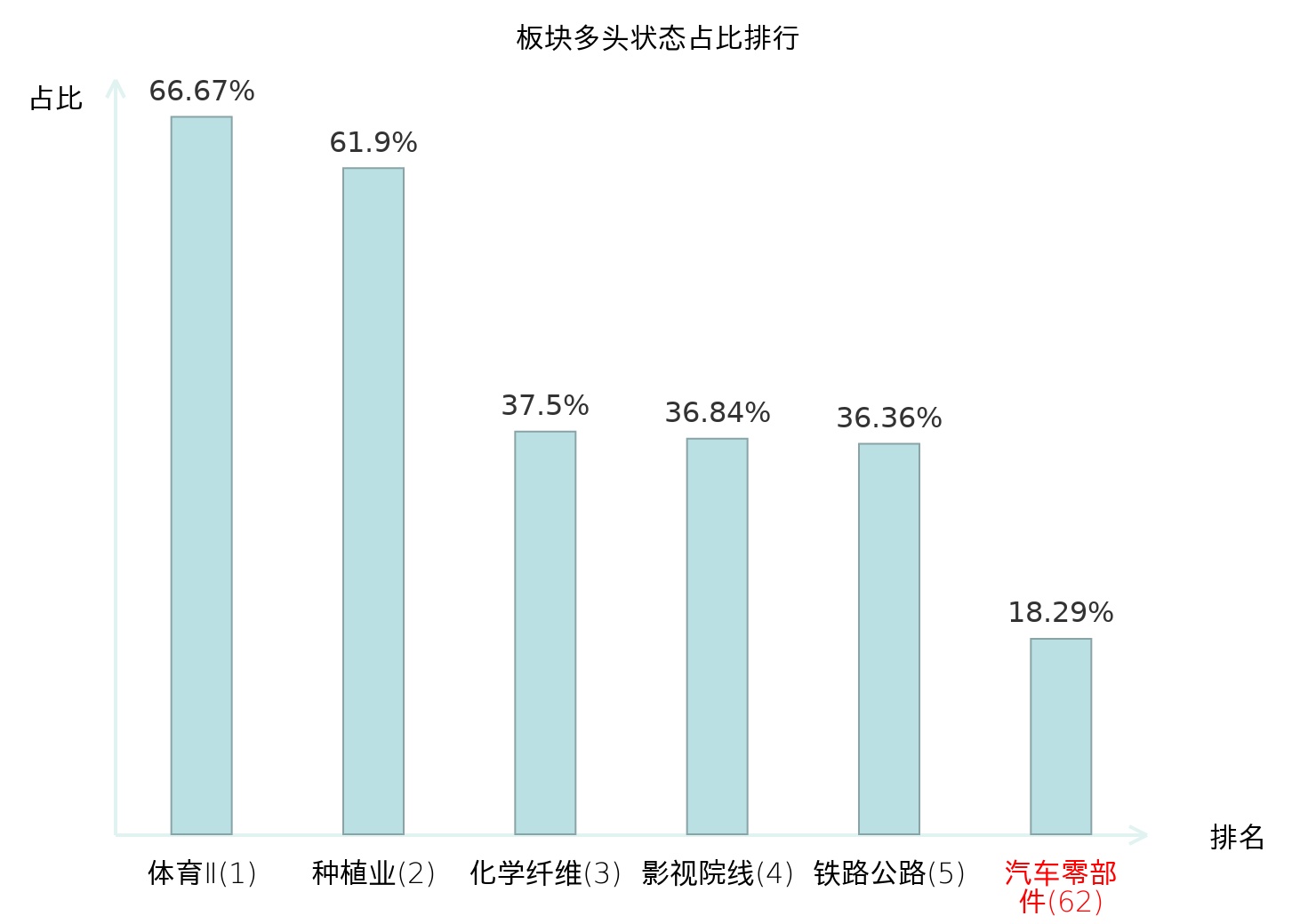 全市场所有行业板块中主力多头状态占比排名中,体育Ⅱ板块位居第一。种植业板块名次提升最快,较昨日上升65位。