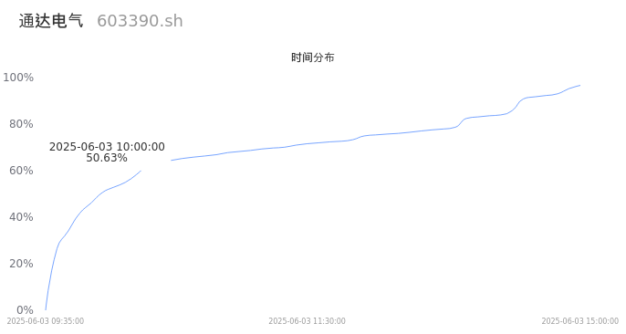 603390通达电气2025年06月03日成交85.49万手,成交金额14.74亿,相较昨日缩量15.24万手,换手率24.44%,成交活跃。