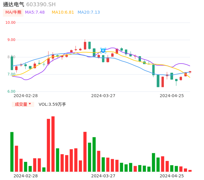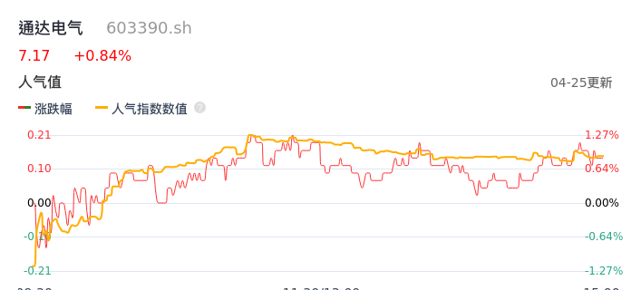 04月25日,通达电气收报7.17,股价涨幅0.84%,成交金额2562.67万元,换手率1.03%。