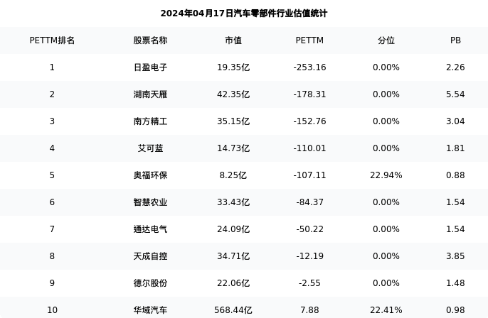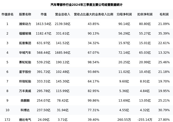 通达电气最新报告期数据为三季度,下表汇总了汽车零部件行业内市值靠前的公司三季度主要经营数据