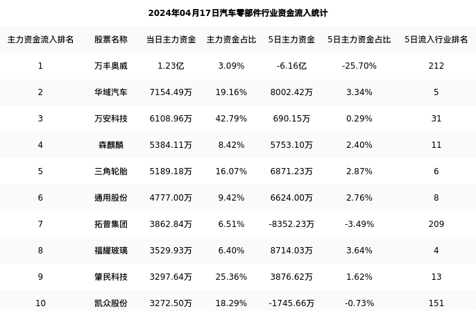 从主力资金流向来看,汽车零部件行业今日主力资金流入89.52亿元,在所有申万二级行业中排名:120/131。