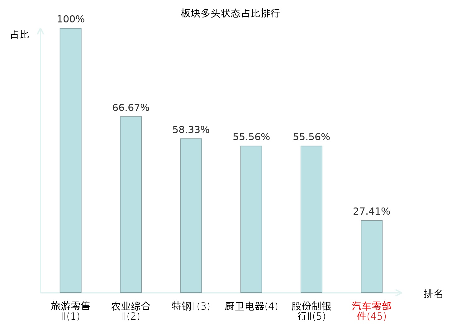 全市场所有行业板块中主力多头状态占比排名中,旅游零售Ⅱ板块位居第一。农业综合Ⅱ板块名次提升最快,较昨日上升127位。