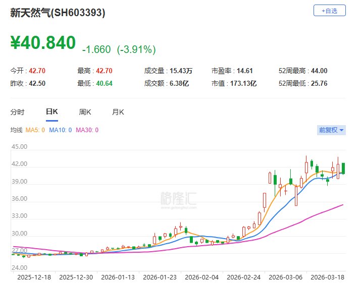 A股异动丨新天然气跌逾4% 尹显峰拟减持不超0.99%公司股份