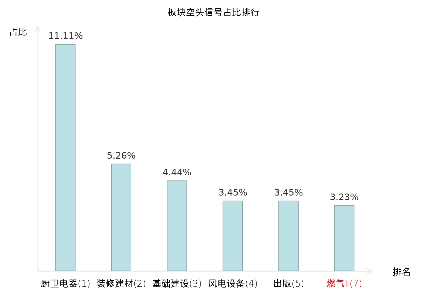 全市场所有行业板块中主力空头信号占比排名中,厨卫电器板块位居第一。塑料板块名次提升最快,较昨日上升121位。