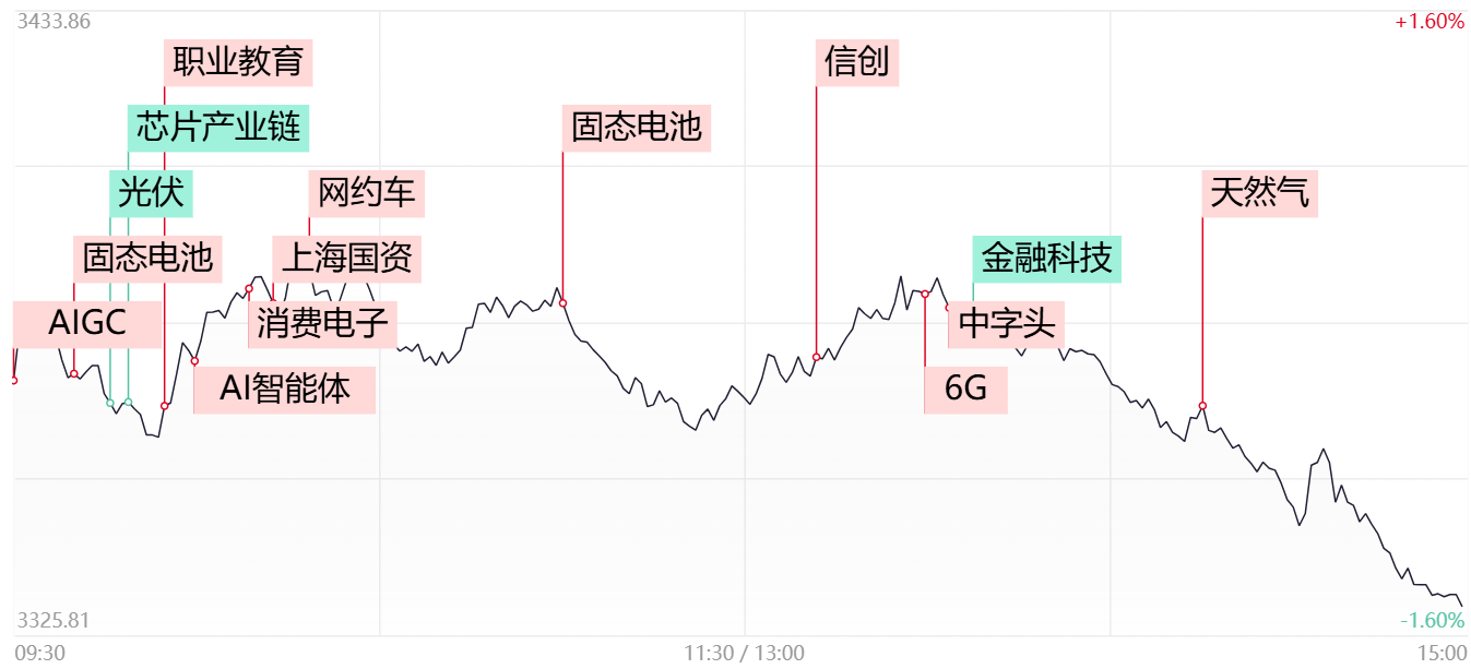 市场午后单边下行,创业板指连续两日跌超3%,多只权重股大跌,同花顺跌近15%,东方财富跌超6%,全市场超4300只个股下跌,超20家个股跌停。全天仅有人工智能(智能体)、消费电子等题材相对活跃。沪深两市全天成交额1.83万亿,较上个交易日缩量120亿。盘面上,AI应用方向逆势爆发,福石控股、天娱数科、金财互联、中科金财等涨停。消费电子概念股一度冲高,国光电器、奥海科技等涨停。下跌方面,芯片股持续调整,拓荆科技跌超10%;光伏概念股震荡走低,沐邦高科跌停。截至收盘,沪指跌1.45%,深成指跌2.62%,创业板指跌3.91%。