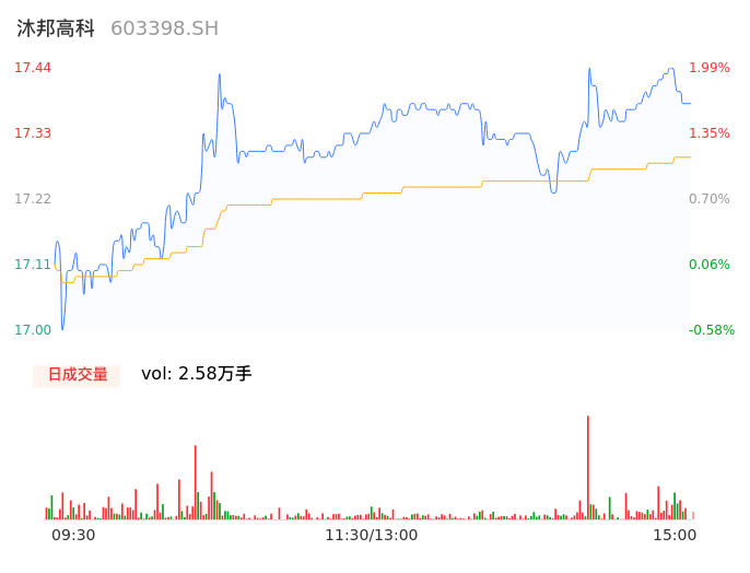 04月26日,沐邦高科收报17.39,股价涨幅1.70%,成交金额4460.35万元,换手率0.75%。