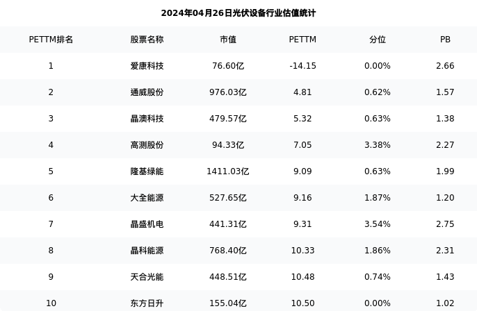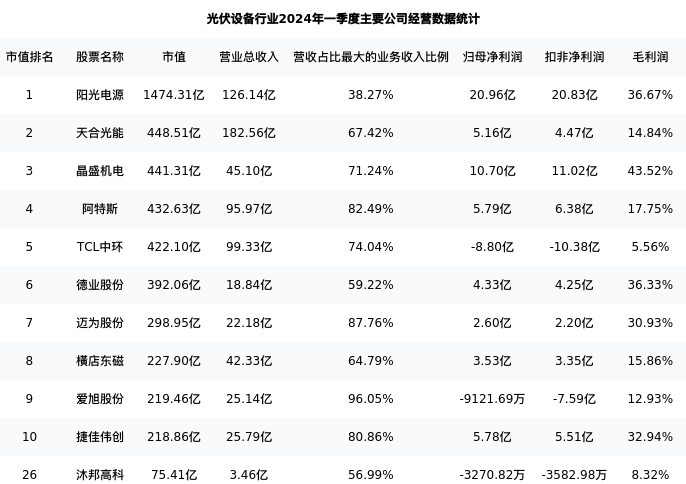 沐邦高科最新报告期数据为一季度,下表汇总了光伏设备行业内市值靠前的公司一季度主要经营数据