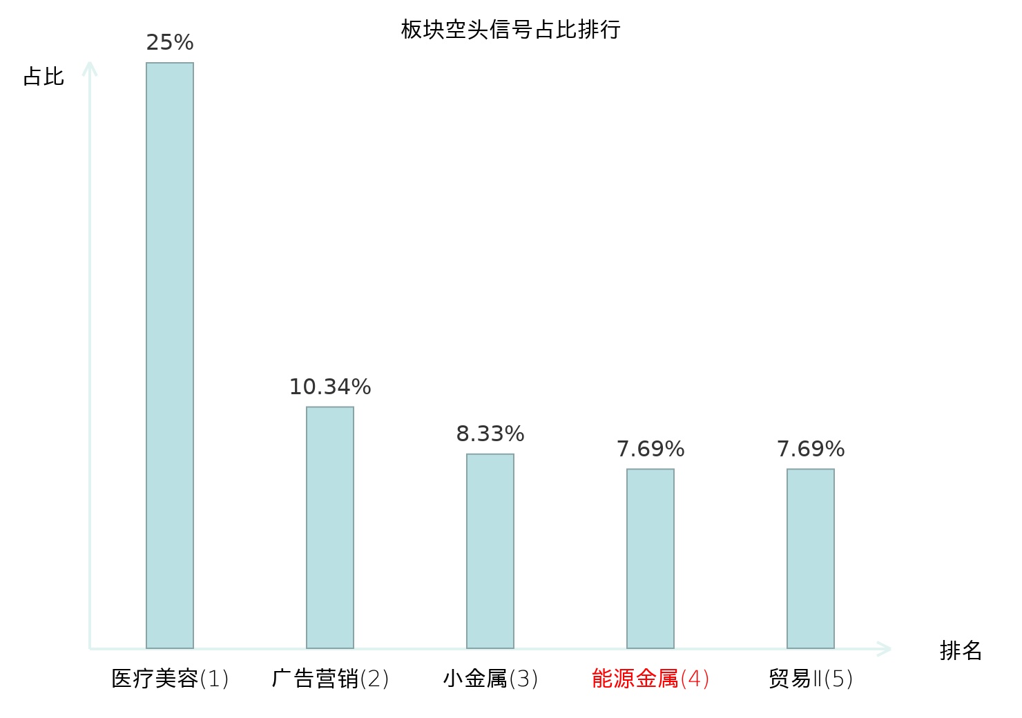 全市场所有行业板块中主力空头信号占比排名中,医疗美容板块位居第一。广告营销板块名次提升最快,较昨日上升113位。