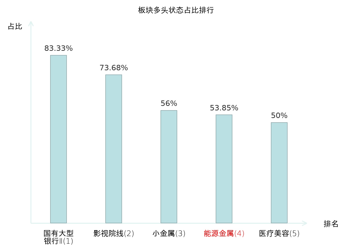 全市场所有行业板块中主力多头状态占比排名中,国有大型银行Ⅱ板块位居第一。电视广播Ⅱ板块名次提升最快,较昨日上升99位。