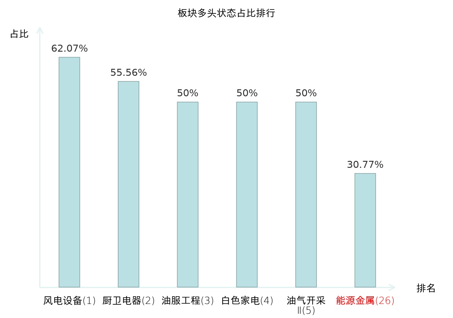 全市场所有行业板块中主力多头状态占比排名中,风电设备板块位居第一。专业连锁Ⅱ板块名次提升最快,较昨日上升65位。