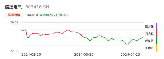 我们来看一下该股的九方特色指标强弱趋势的情况:信捷电气自04月17日从支撑区回到观望区。股价前期快速下跌后经过中途弱势整理。目前短期处于弱势反弹迹象,后续重点关注能否站上多空分界点:28.31元。如未能有效突破则说明弱势反弹行情结束。后续可能再次进入空头行情。