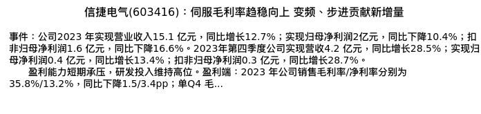 值得注意的是:2024年04月西南证券的韩晨分析师,首次发布关于信捷电气的研究报告,标题为:信捷电气(603416):伺服毛利率趋稳向上 变频、步进贡献新增量。