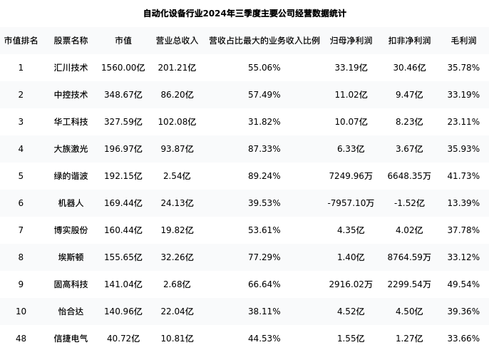 信捷电气最新报告期数据为三季度,下表汇总了自动化设备行业内市值靠前的公司三季度主要经营数据