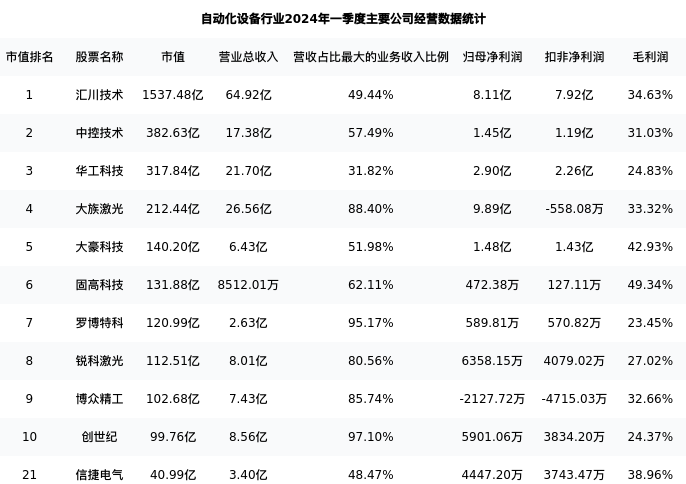 信捷电气最新报告期数据为一季度,下表汇总了自动化设备行业内市值靠前的公司一季度主要经营数据