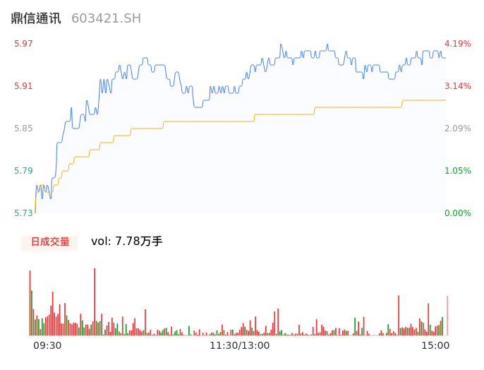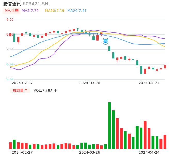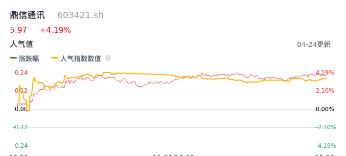 04月24日,鼎信通讯收报5.97,股价涨幅4.19%,成交金额4583.37万元,换手率1.19%。