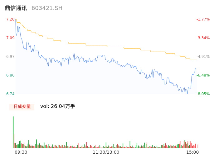 04月02日,鼎信通讯收报6.90,股价涨幅-5.87%,成交金额1.81亿元,换手率3.99%。