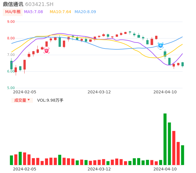 04月10日,鼎信通讯收报6.32,股价涨幅-2.77%,成交金额6352.13万元,换手率1.53%。