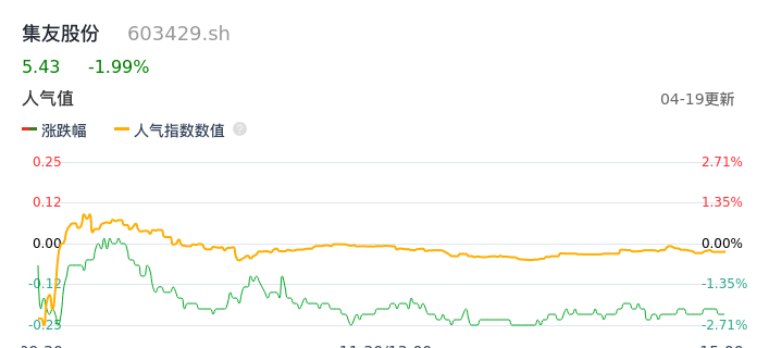 04月19日,集友股份收报5.43,股价涨幅-1.99%,成交金额2729.95万元,换手率0.96%。