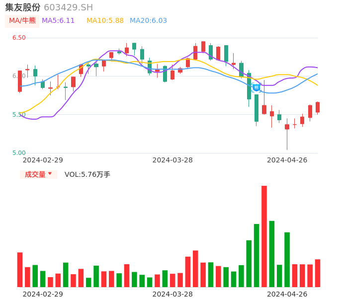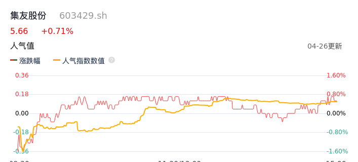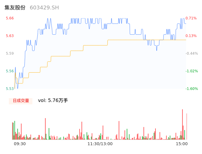 04月26日,集友股份收报5.66,股价涨幅0.71%,成交金额3239.69万元,换手率1.10%。