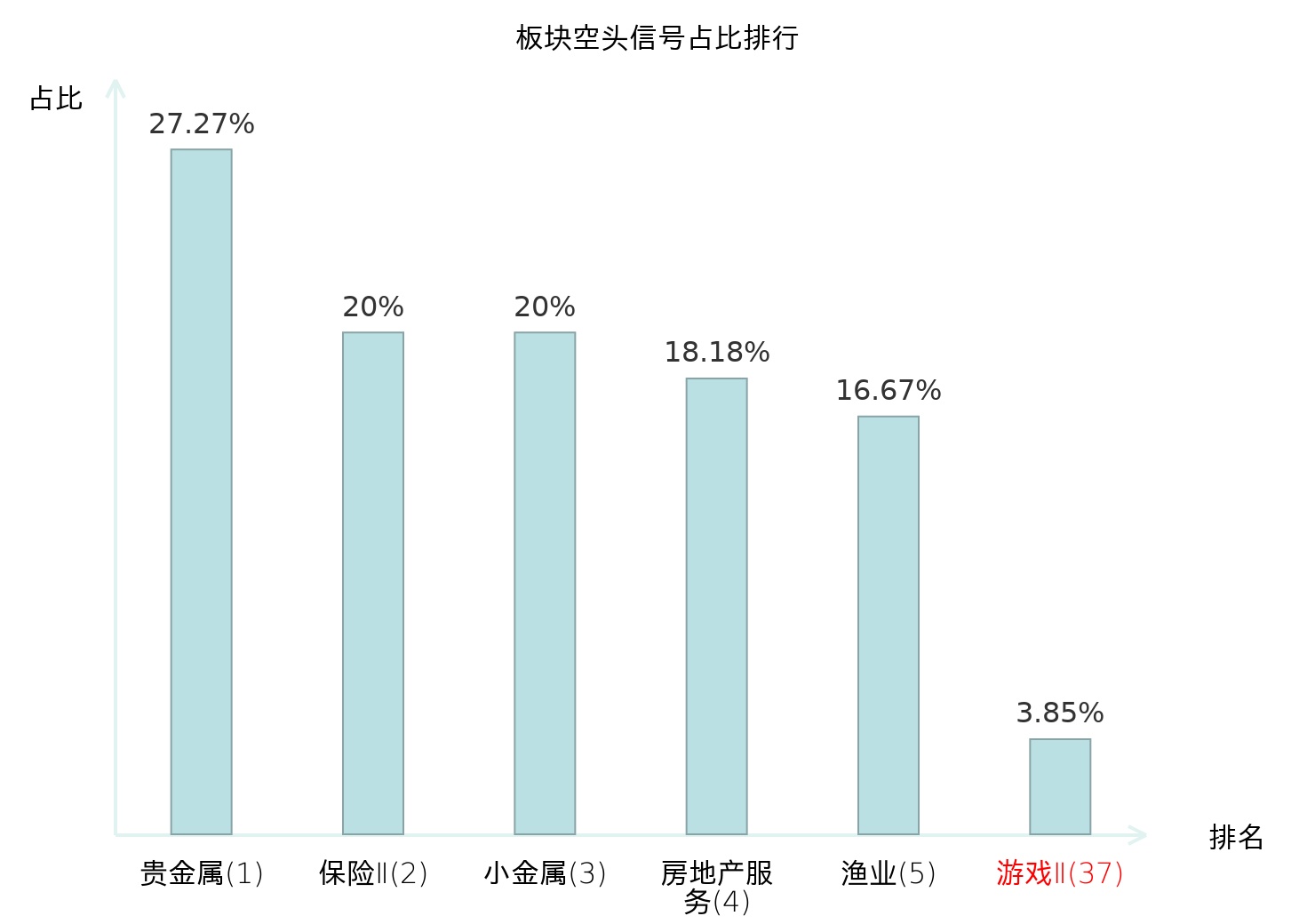 全市场所有行业板块中主力空头信号占比排名中,贵金属板块位居第一。小金属板块名次提升最快,较昨日上升117位。