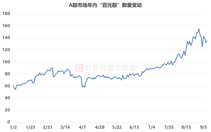 注:A股市场年内“百元股”数量变动(截至9月10日收盘)