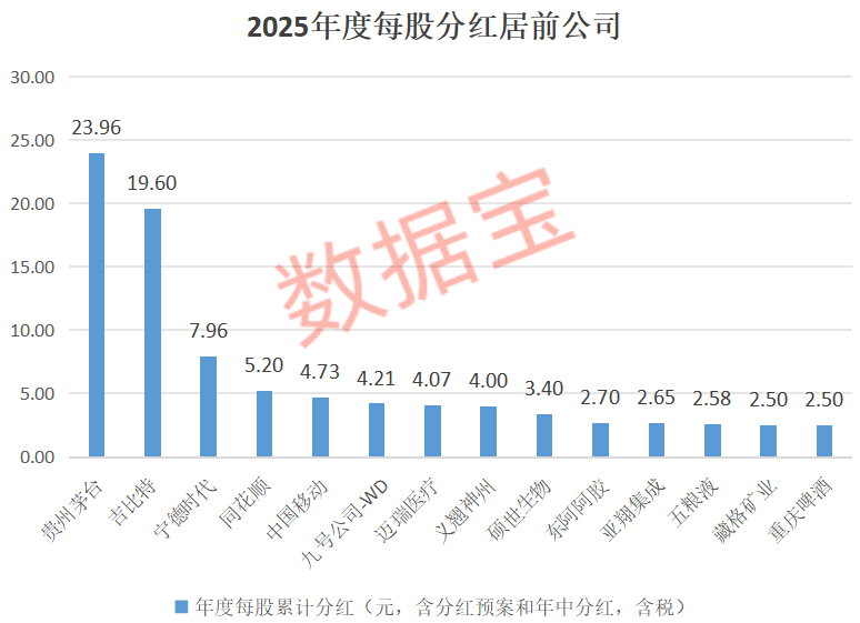 从已宣告的年报每股分红来看,吉比特暂居第一,超过宁德时代的10派69.57元(含税)。从2025年年度分红来看,吉比特位列贵州茅台之后,排名第二,贵州茅台在三季报实施了10派239.57元(含税)的分红。