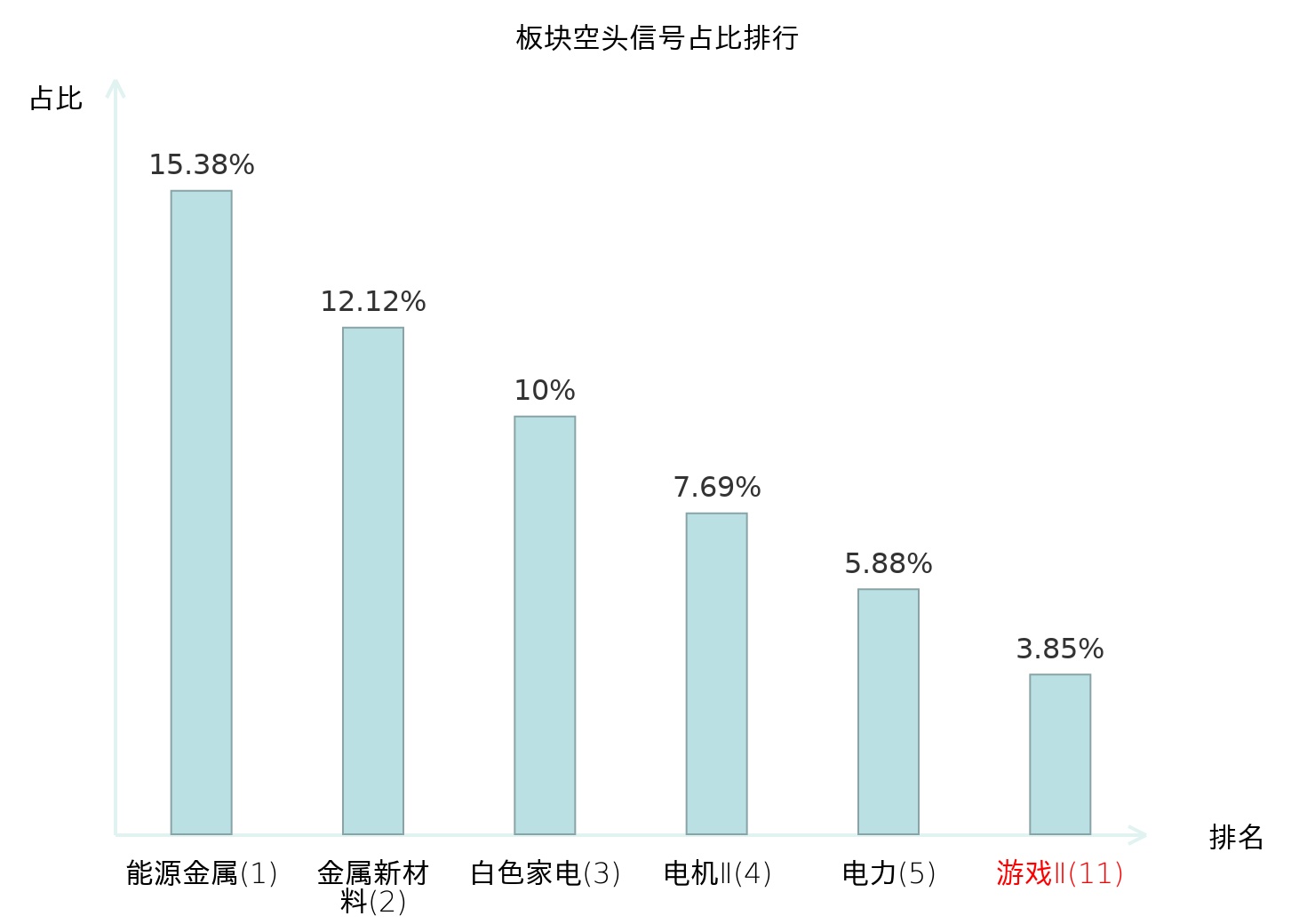 全市场所有行业板块中主力空头信号占比排名中,能源金属板块位居第一。医疗服务板块名次提升最快,较昨日上升106位。