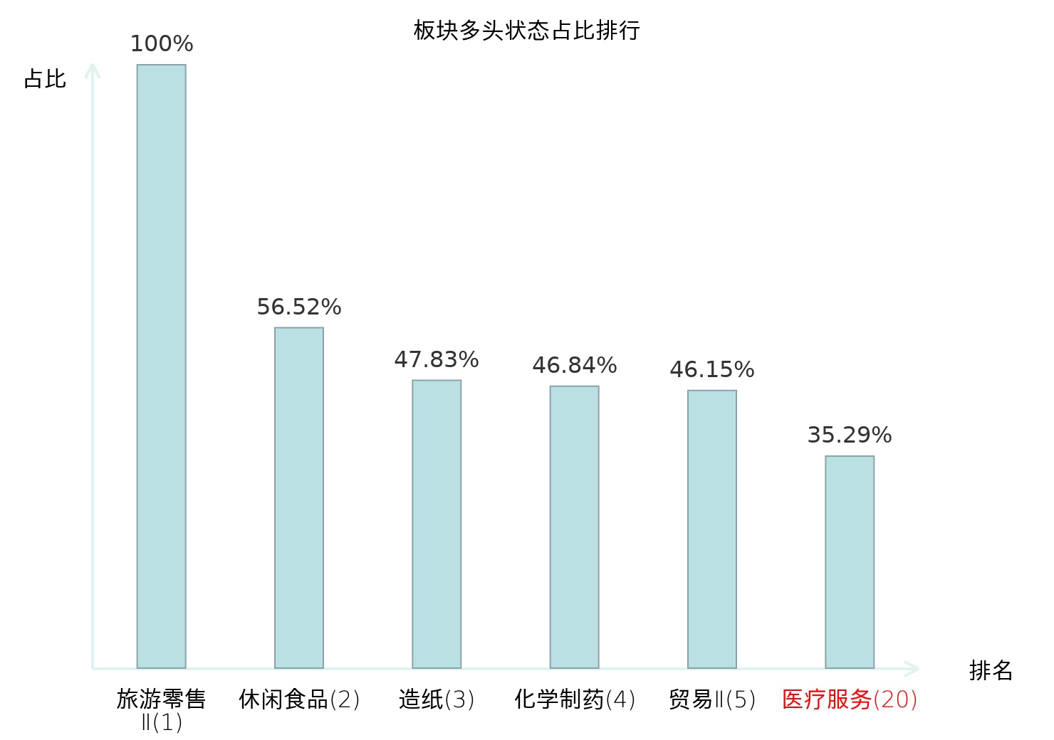 全市场所有行业板块中主力多头状态占比排名中,旅游零售Ⅱ板块位居第一。动物保健Ⅱ板块名次提升最快,较昨日上升58位。