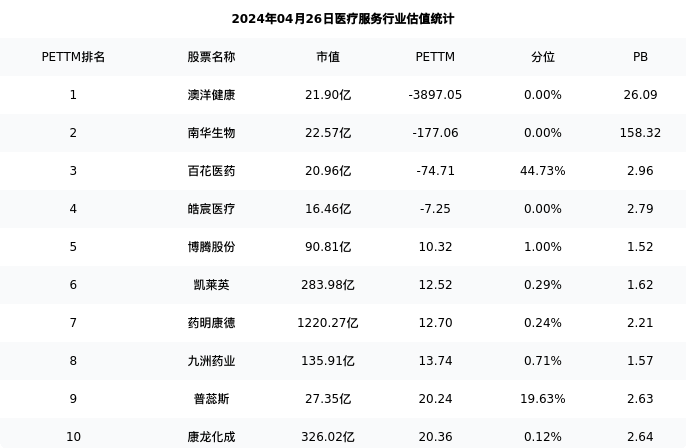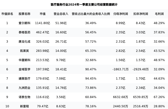 九洲药业最新报告期数据为一季度,下表汇总了医疗服务行业内市值靠前的公司一季度主要经营数据