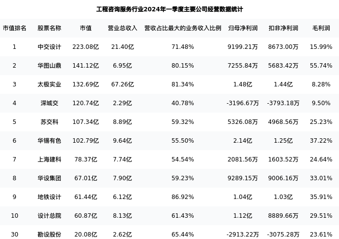 勘设股份最新报告期数据为一季度,下表汇总了工程咨询服务行业内市值靠前的公司一季度主要经营数据