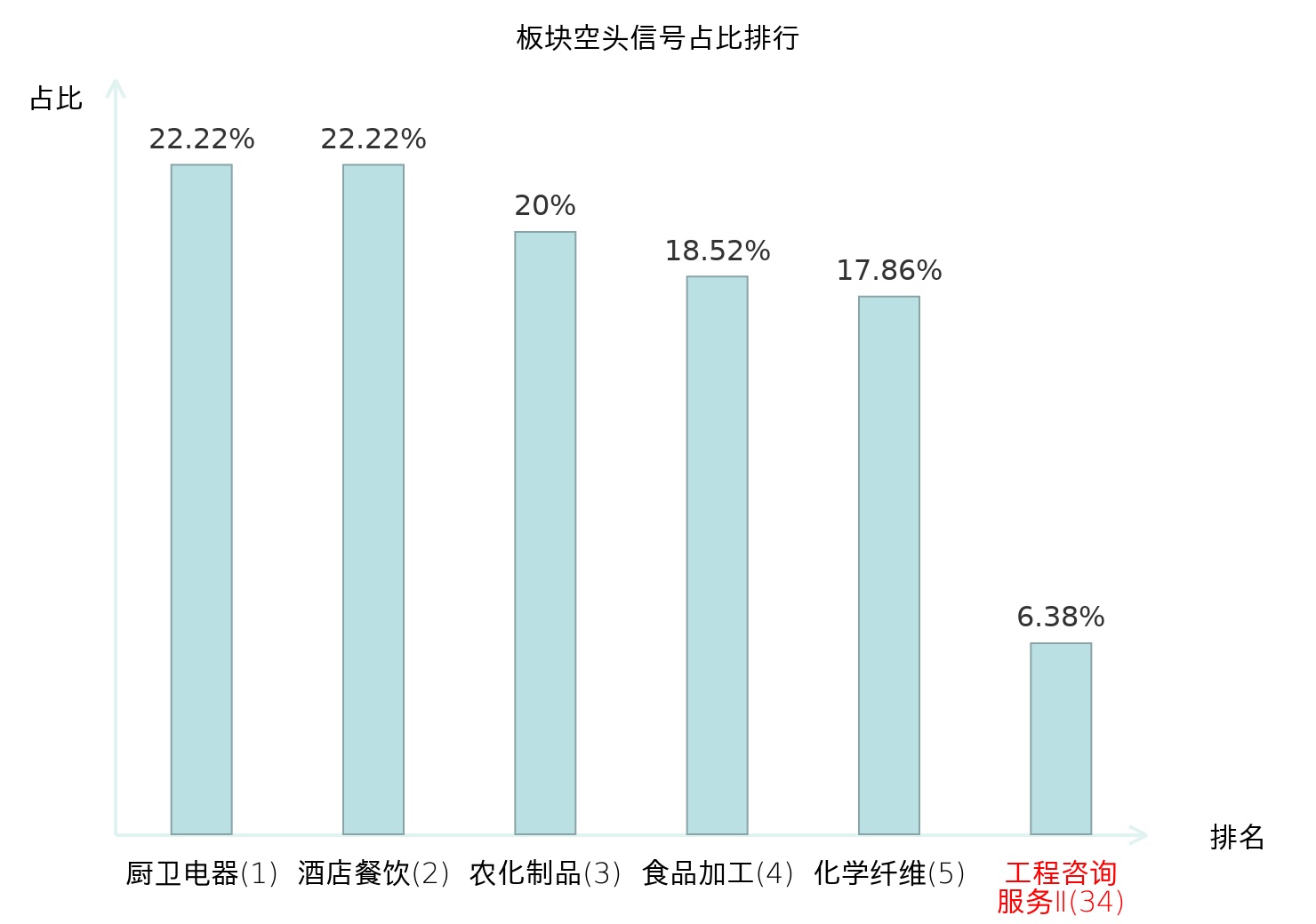 全市场所有行业板块中主力空头信号占比排名中,厨卫电器板块位居第一。化学纤维板块名次提升最快,较昨日上升119位。