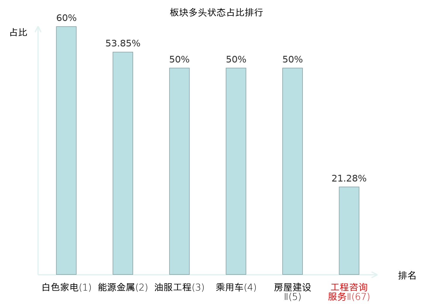 全市场所有行业板块中主力多头状态占比排名中,白色家电板块位居第一。油气开采Ⅱ板块名次提升最快,较昨日上升45位。