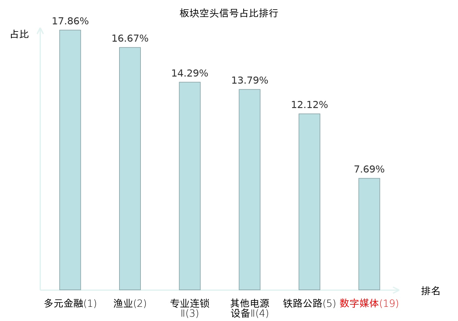 全市场所有行业板块中主力空头信号占比排名中,多元金融板块位居第一。多元金融板块名次提升最快,较昨日上升128位。