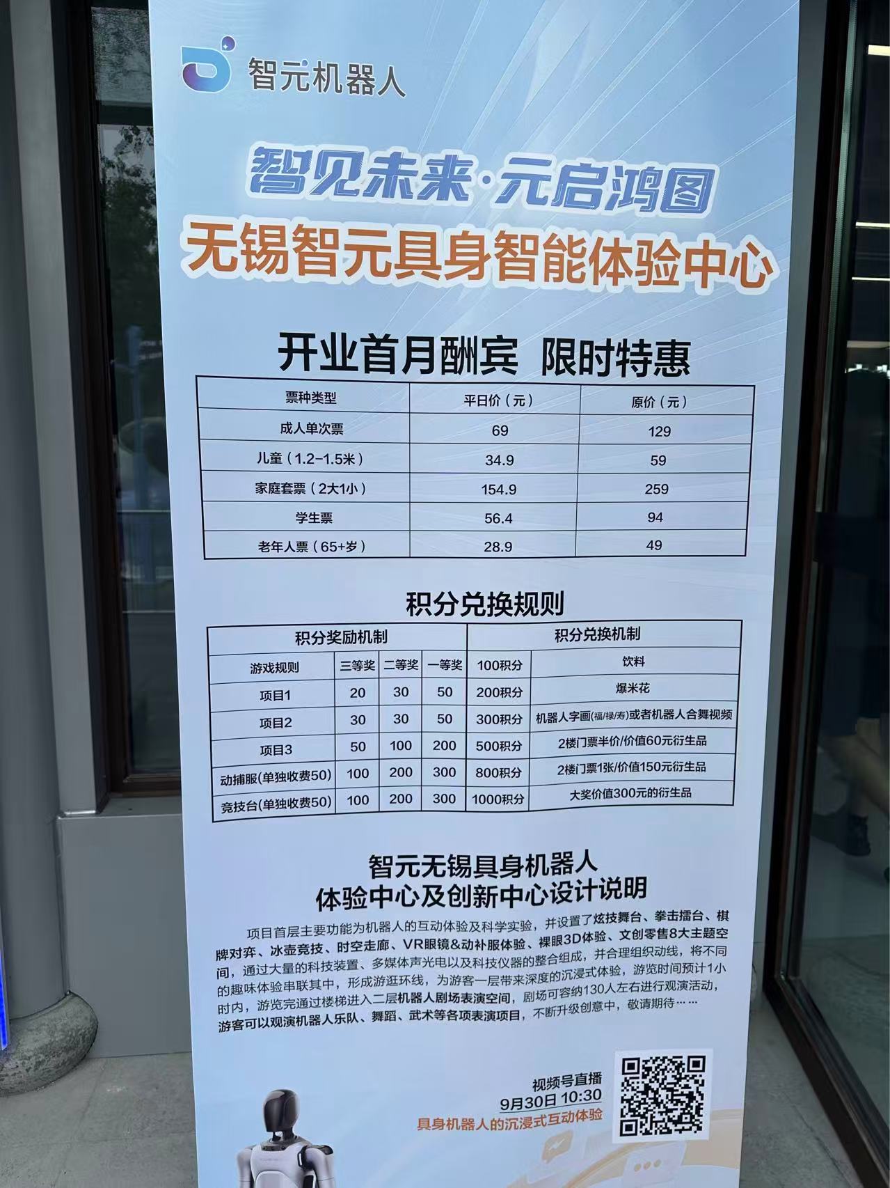 该具身智能体验中心,占地1300平方米,参观票定价59.9元/人;通票定价为工作日128元/人,节假日148元/人,开业首月提供6折优惠。